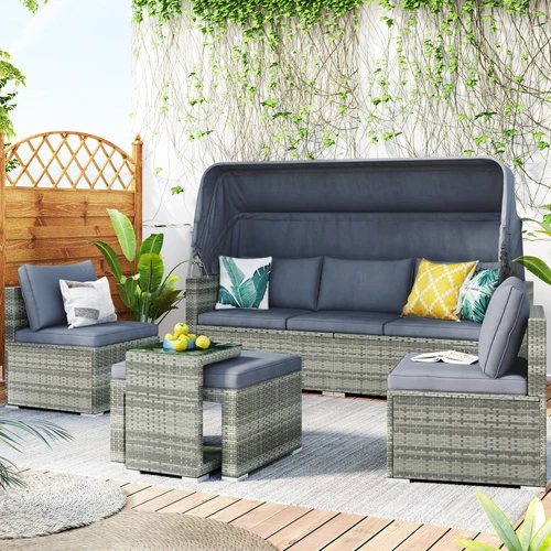 Free Shipping Dropshipping 5 Pieces Outdoor Sectional Patio Rattan Sofa Set Rattan Daybed Conversation Furniture Set