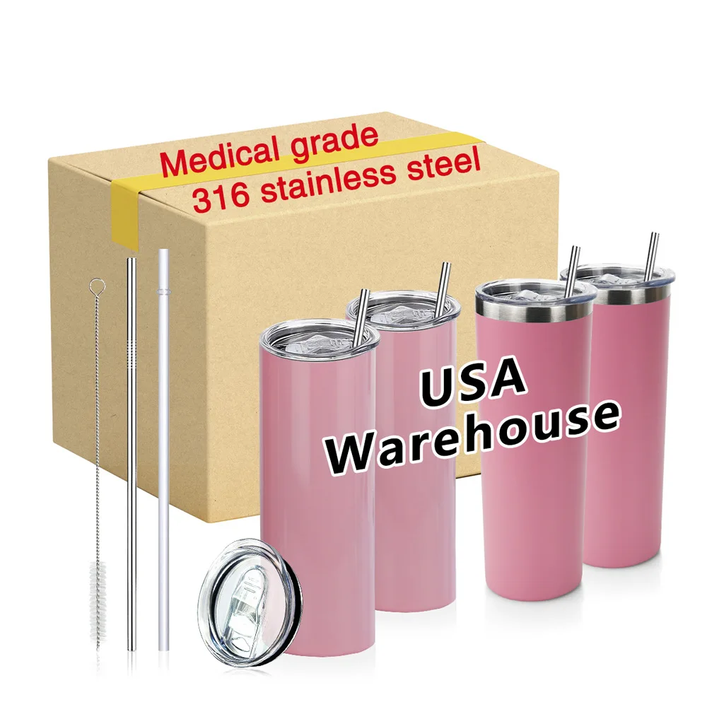USA Warehouse Free Shipping 316 Stainless Steel 20oz Skinny Tumblers Pink Straight Sublimation Tumbler With Brush And 2 Straws